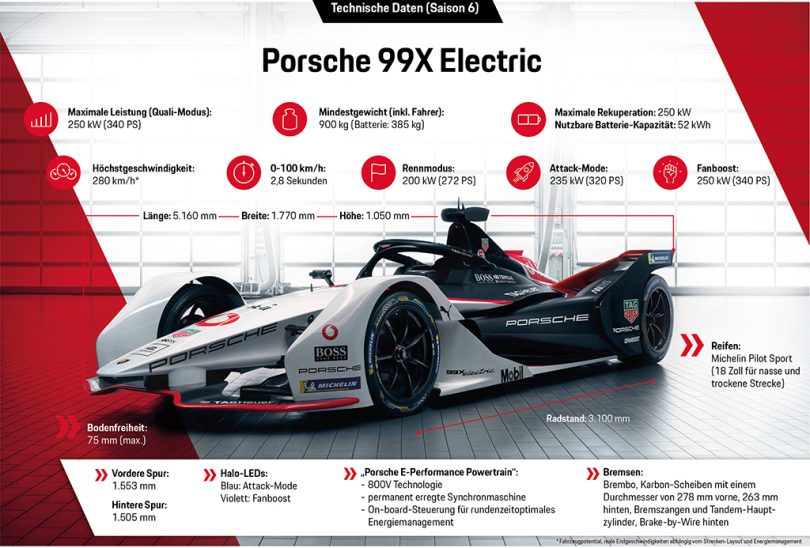 Für das Design des Formel-E-Rennwagen fiel die Wahl auf die klassischen Porschefarben. Aus der Vogelperspektive ist ein Porsche-Wappen rund um den Halo zu erkennen. Der Name des Monoposto besteht Porsche-typisch aus drei Ziffern. Die höchste Zahl, neun, wurde zweimal vergeben, um den Stellenwert des Formel-E-Projekts für Porsche zu unterstreichen, während das X für Zukunftsorientierung steht. Der erste Auftritt des Teams ist Mitte Oktober 2019 beim Formel-E-Test im spanischen Valencia, das erste Rennen folgt dann im November.