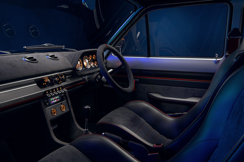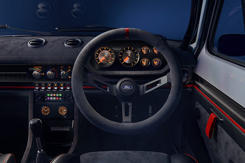 Das minimalistische Interieur spiegelt den Geist des ursprünglichen Escort wieder, wenngleich hochwertige Materialien wie Alcantara und Leder das originale Plastik und Vinyl ersetzen. Auch das, was sich hinter dem Armaturenbrett befindet wurde aufgefrischt. Die runden Lüftungsdüsen folgen in ihrer Form dem Original, aber dahinter befindet sich jetzt aber eine Klimaanlage. Beheizbare Scheiben und tiefe Sportsitze sowie ein kleiner Touchscreen, auf dem Apple CarPlay läuft, vervollständigen die Ausstattung. Serienmäßig ist der Escort mit Dreipunktgurten bestückt, alternativ gibt es Vierpunktgurte. Für die Sicherheit gibt es einen Überrollkäfig im Rallye-Stil mit abnehmbaren Türstangen und auch Sturzhelme finden ihren Platz in speziellen Ablagen.
