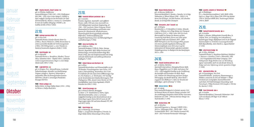 Der „Car Guys Kalender“ stellt rund 2000 wichtige Personen der Automobil- und Motorradgeschichte mit stenografisch zusammengefassten Viten vor. Hinter jedem Namen steckt eine faszinierende Lebensgeschichte. Wer möchte, kann sich Tag für Tag dazu inspirieren lassen, das Leben und Wirken einzelner „Car Guys“ intensiver zu studieren. „Car Guys Kalender“ ist dank seines alphabetischen Index aber genauso gut als einzigartiges Nachschlagewerk verwendbar.